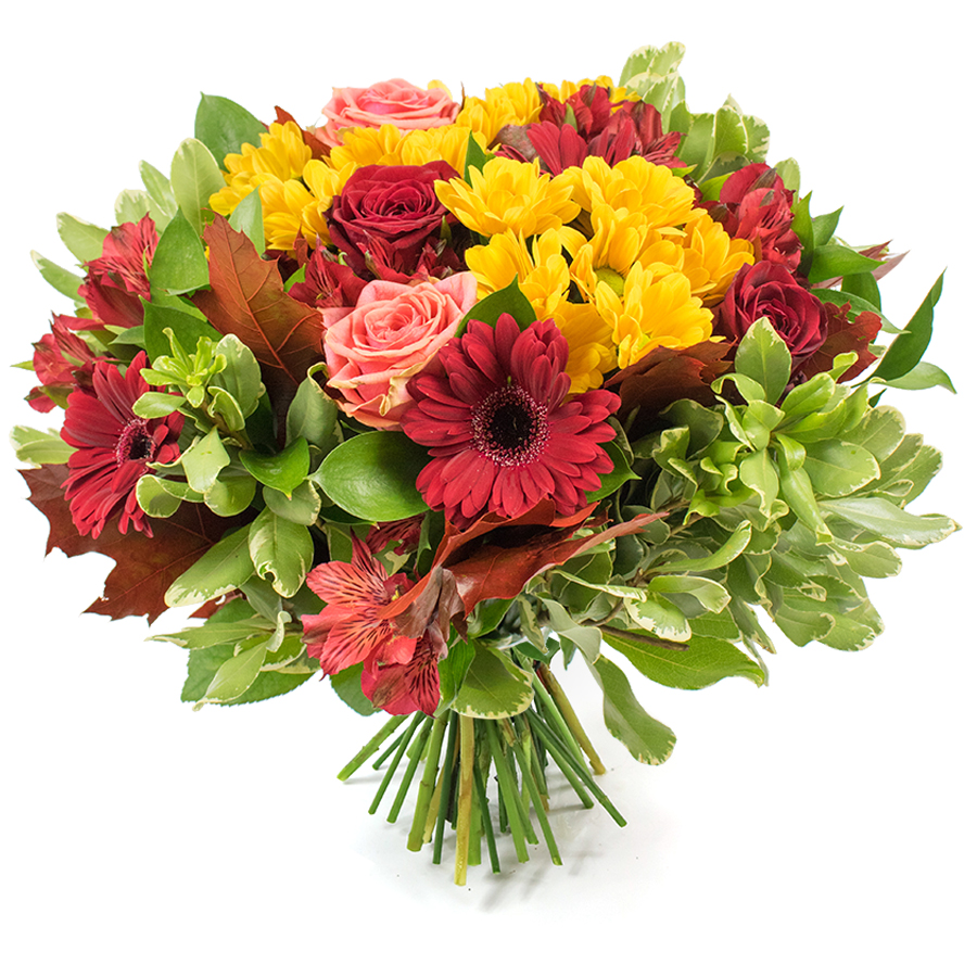 Celebrate the season with our beautiful and unique flower arrangement. This elegant bouquet combines roses, gerberas, and alstroemeria, artfully arranged to bring color and joy to any setting.