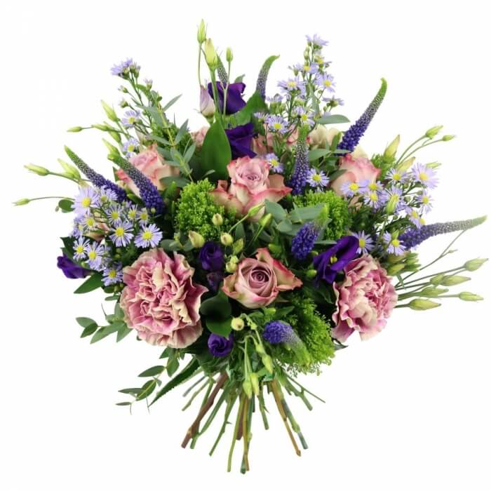 Introducing the Elegant Blooms Collection, a masterpiece of floral artistry crafted to bring joy and sophistication to any setting. This exquisite bouquet features a vibrant palette of roses, carnations, veronica, asters, and lisianthus, each flower carefully selected for its superior quality and lasting freshness.